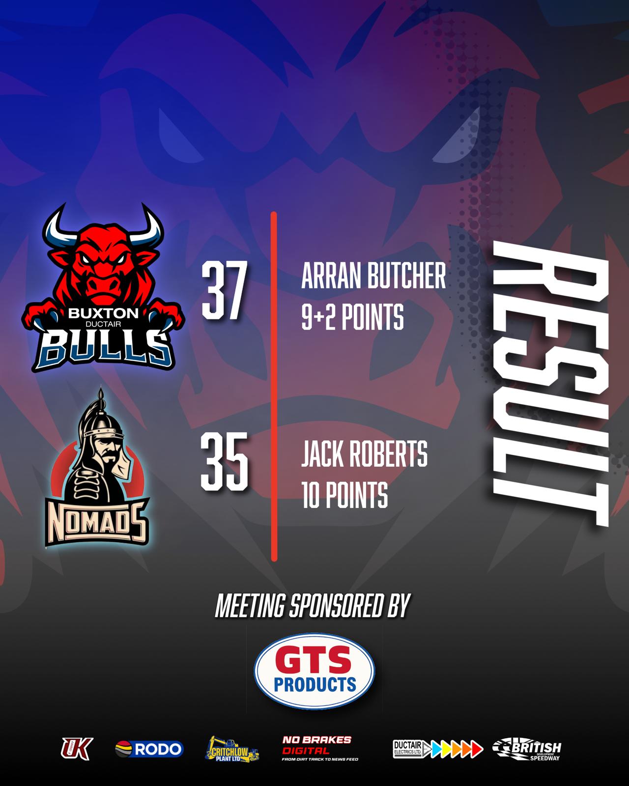 The meeting was curtailed after twelves races with the result standing after Bulls skipper Jack Smith and Nomads captain Connor Coles crashed in heat thirteen resulting in former Potters rider Coles being taken to hospital leaving SCB referee Graeme Hunter no option but to abandon the meeting due to lack of medical cover.